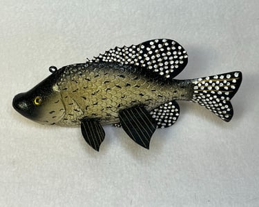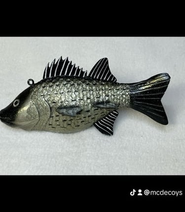 Series 13 Black Crappie spearing decoy has a realistic look with a MC Decoys twist. Nice swimming decoy. All decoys are swim tested, signed and dated, with series number and the number in the series.