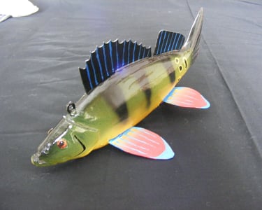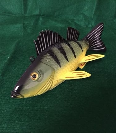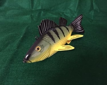 Most popular MC Decoy Series 8 Yellow perch Spear Fishing Decoy measures approx. 9" long with aluminum fins. Comes with Myron's unique Yellow Perch paint job. All decoys are swim tested, signed and dated, with series number and the number in the series.
