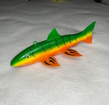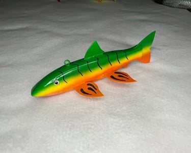 Series 2 Fire Tiger Spear Fishing Decoy measures approx. 9" long with aluminum fins. Comes with Myron's unique fire tiger paint job (Green,Yellow,and Orange)with Black Striping. Smooth body (no scales) for a slimmer and more effective style and you won't find anything that swims better!! All decoys are swim tested, signed and dated, with series number and the number in the series.