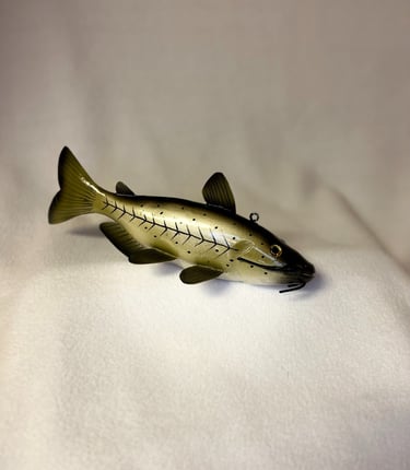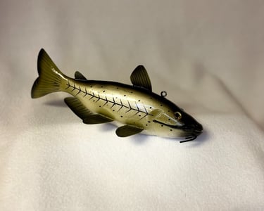 Series 20 Catfish is a 9" hand crafted sculptured decoy with a MC Decoys custom paint job. This is a nice swimming decoy. Fins are pinned in place for a rugged working decoy. All decoys are weighted and swim tested. Decoys are signed with the series number and number in the series.