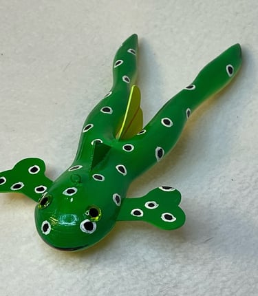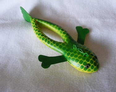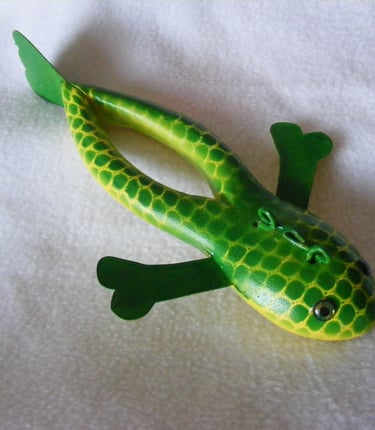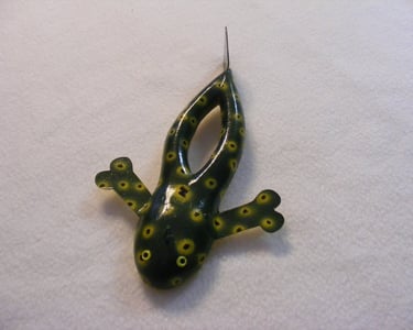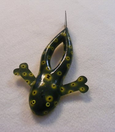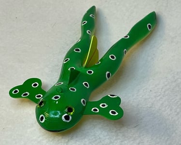 Series 4 Frog Spear Fishing Deco measures approx. 8.5" long with aluminum fins. This is a very unique decoy as most decoys out there are fish. Body has been painted in the common green and yellow colors to give it a more realistic look but could be painted in any color. You won't find anything that swims better with metal tail fin for adjusting the swim pattern!! All decoys are swim tested, signed and dated, with series number and the number in the series.