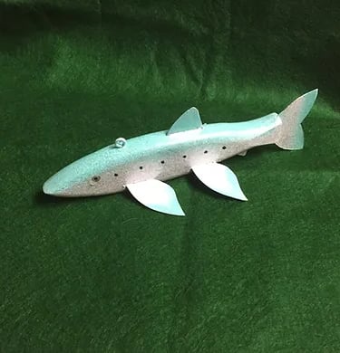 Turquoise and Silver Darter with metal tail and unique glitter paint job. Great working decoy, darts out under the ice and swims back bringing in the big ones. Customize the metal tail to have it swim in a circle. All decoys are swim tested, signed and dated. This decoy on its maiden voyage brought in a 41.5" for me.