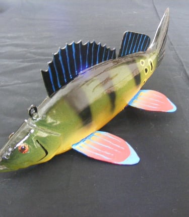 Series 6 Peacock Perch Spear Fishing Decoy measures approx. 9" long with aluminum fins. Comes with Myron's unique Peacock Perch paint job with black Striping. Smooth body (no scales) for a slimmer and more effective style and you won't find anything that swims better!! All decoys are swim tested, signed and dated, with series number and the number in the series.