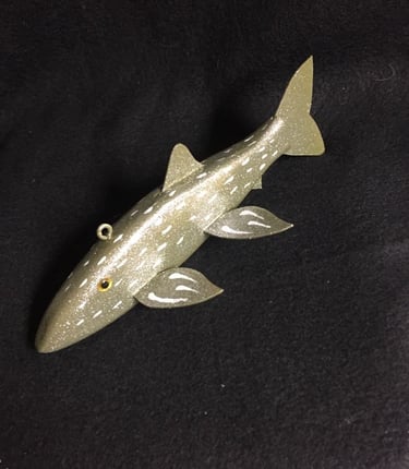 Pike Darter with metal tail and unique glitter paint job. Great working decoy, darts out under the ice and swims back bringing in the big ones. Customize the metal tail to have it swim in a circle. All decoys are swim tested, signed and dated.